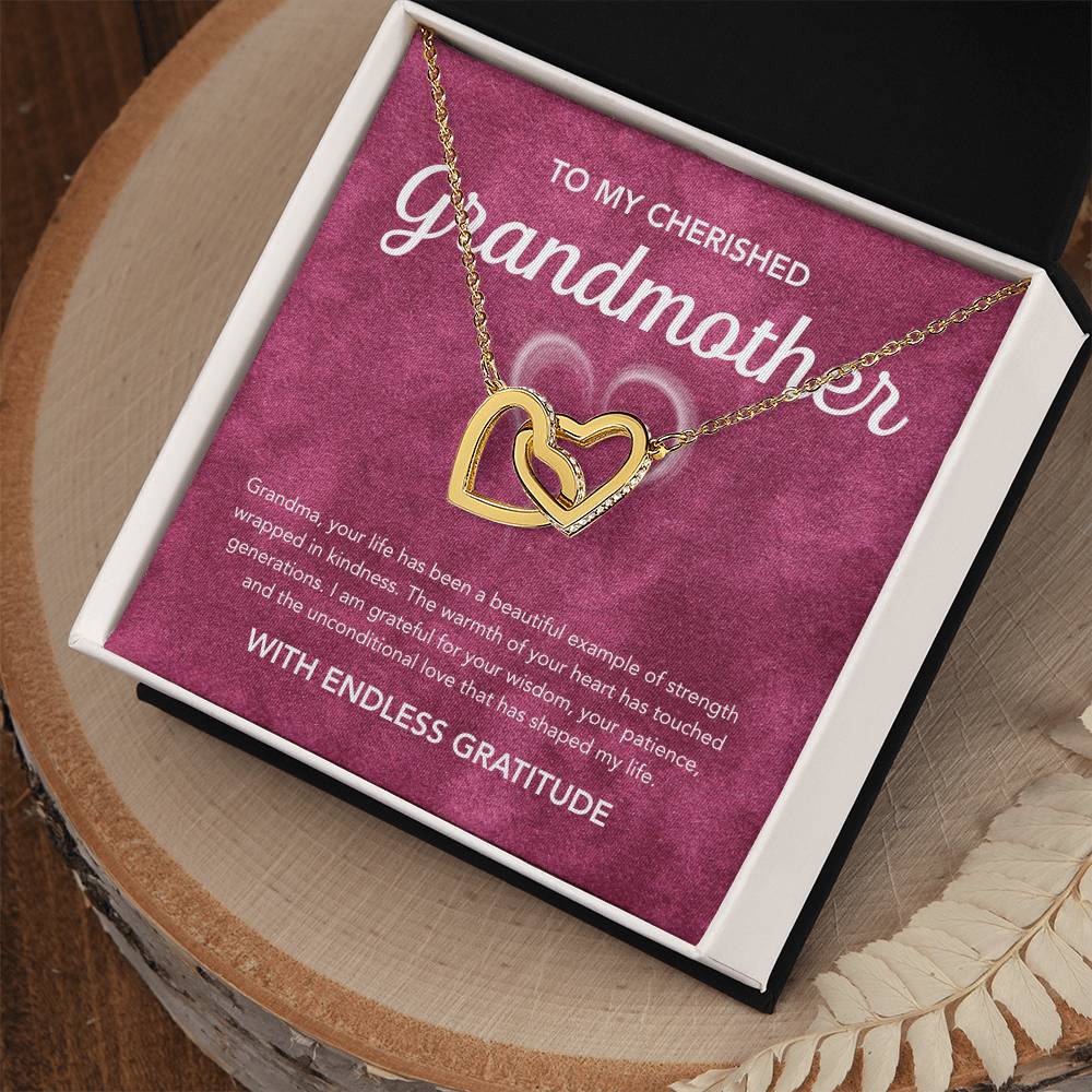 For the woman whose love built generations. The Interlocking Hearts necklace honors her strength, wisdom, and the light she continues to shine.